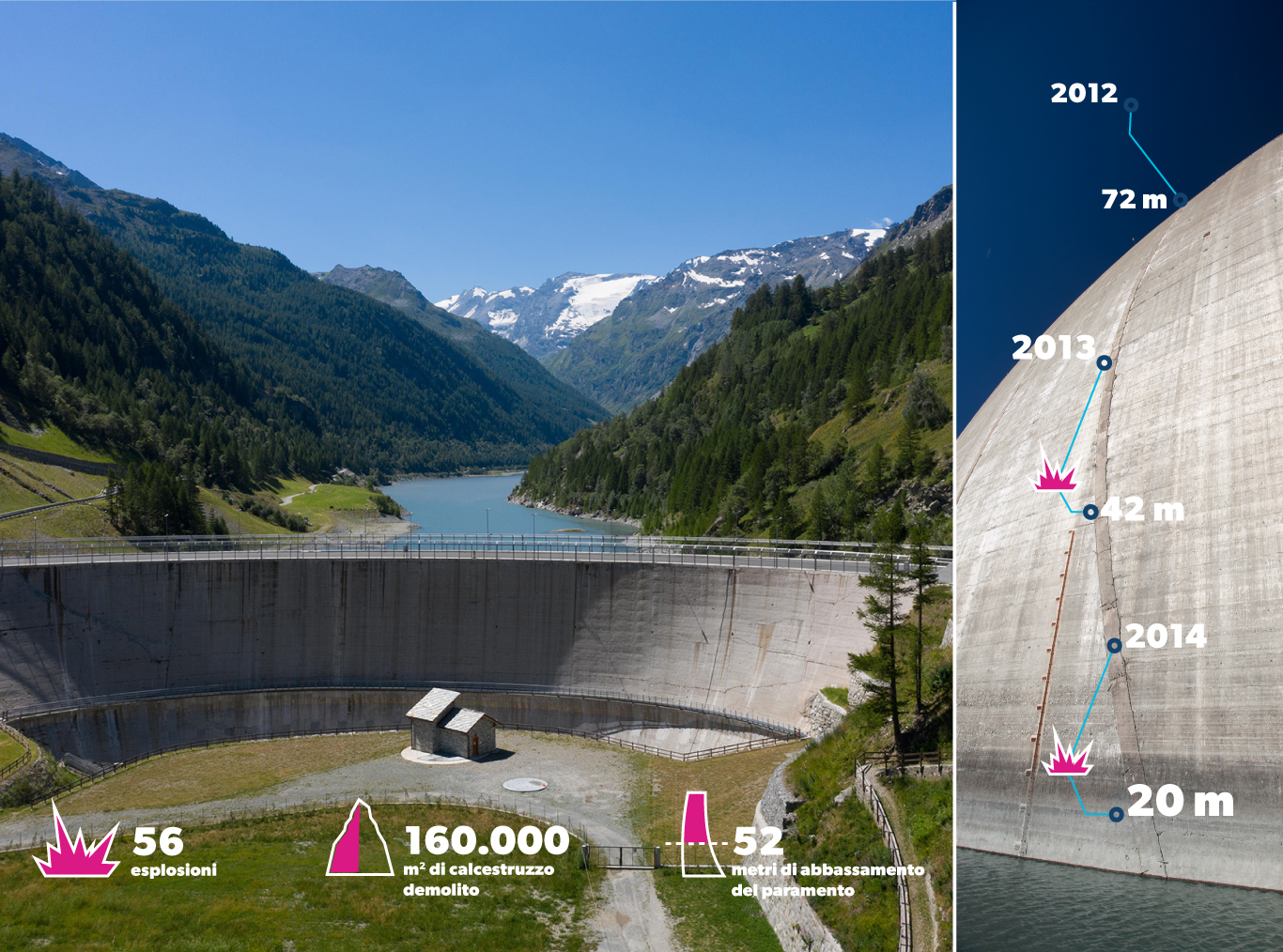 La demolizione, iniziata nella primavera del 2013 e terminata nell'ottobre 2014, ha permesso, tramite 56 diverse esplosioni, di abbassare il paramento di ben 52 metri. Oggi la parte visibile della diga corrisponde a 20 metri di altezza e il suo coronamento è passato da una larghezza di 5,6 metri ad una di 15,5 metri. Infine, dove prima risiedeva la struttura sui lati delle montagne, sono state piantumate specie vegetali autoctone, adatte alle condizioni climatiche del sito.